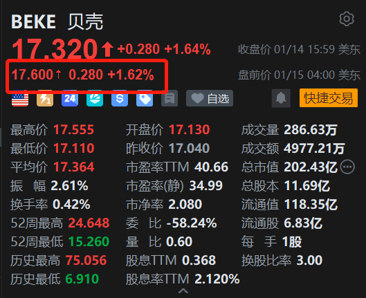美股异动丨贝壳盘前涨1.6% 房地产行业再出政策利好