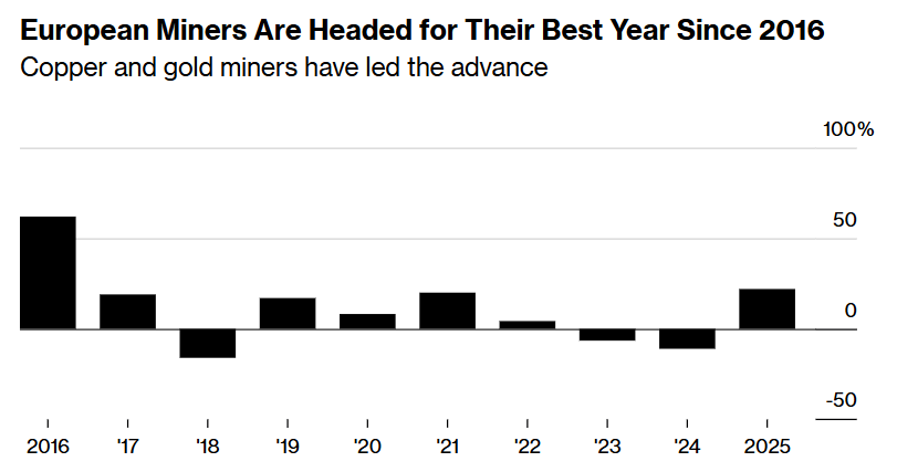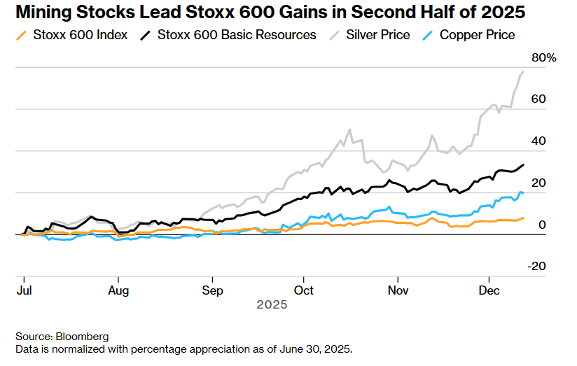 对矿业投资者们而言,2025年,可谓是一个由铜、黄金和白银市场火热所驱动的投资回报爆棚的一年。欧洲股市的Stoxx 600基础资源指数今年迄今上涨22%,在欧洲股票市场的各行业组别中表现排名第三。Oddo矿业分析师Maxime Kogge表示,他对明年矿业股票仍然持看多态度,但也警告称,亚洲经济如果显著放缓可能会破坏市场情绪。