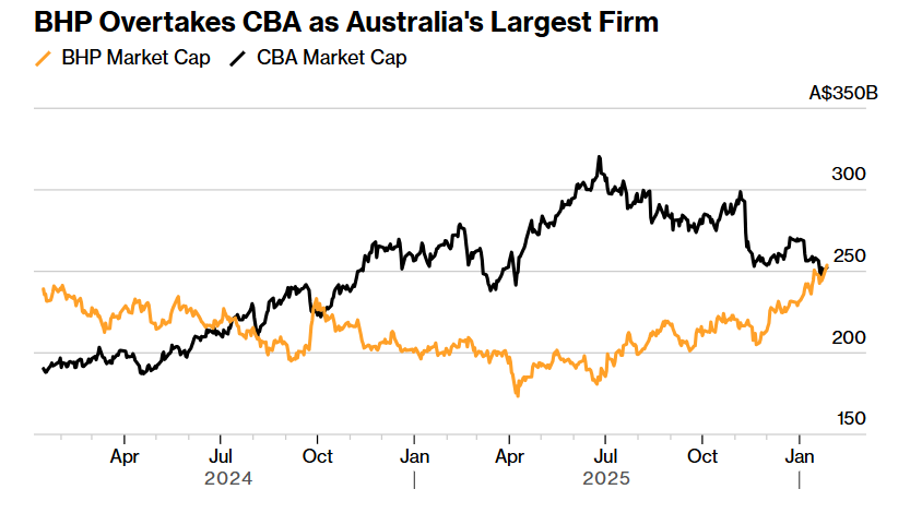 当必和必拓(BHP)在金属价格普涨的助推下超越澳洲联邦银行(CBA),重新成为澳大利亚市值最大公司,这并不只是“指数权重的一次交叉”,而是全球资金把“通胀/地缘/政策不确定性 + 结构性资源短缺 + AI电力化需求”三条线索,统一押注在金属与矿业现金流上的结果。