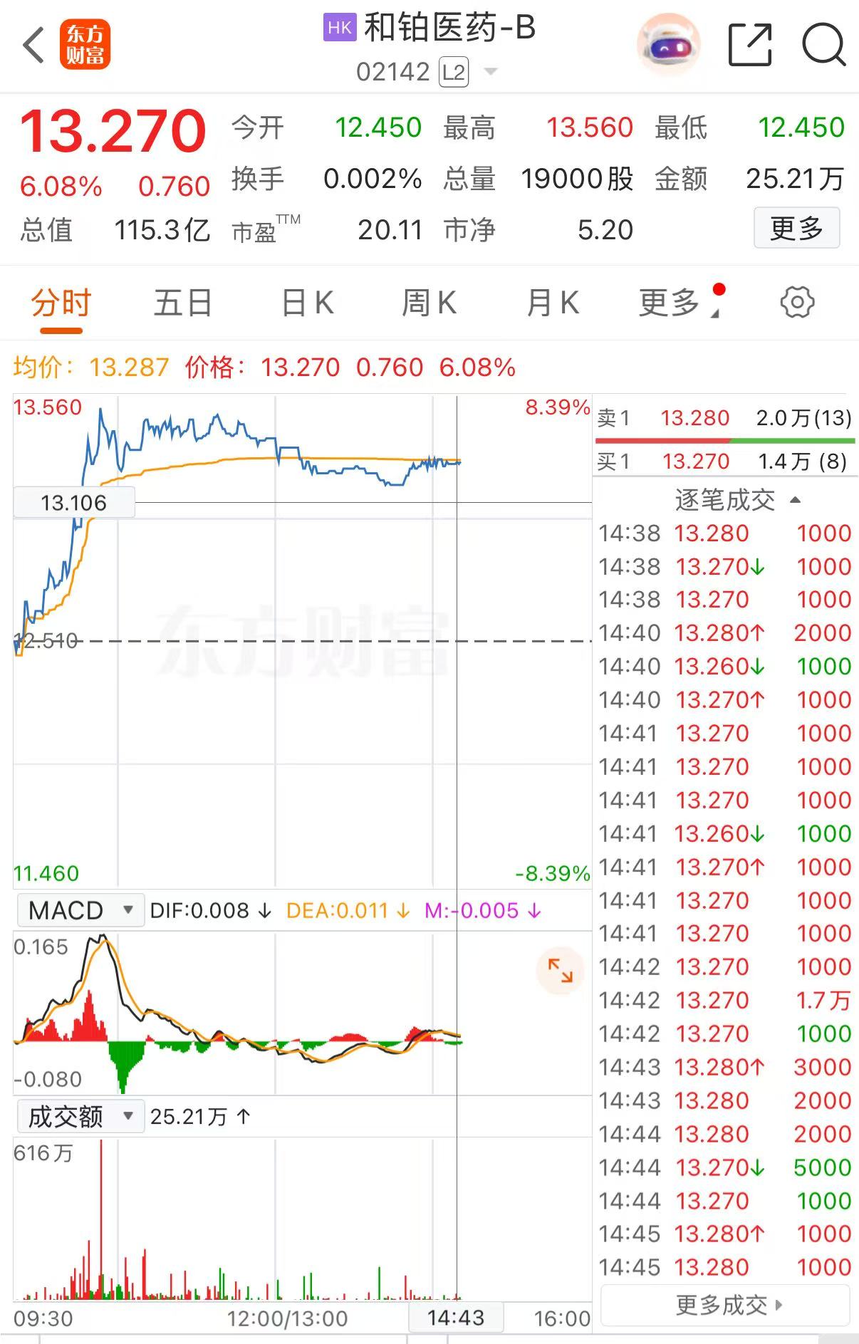 上证报中国证券网讯12月19日,和铂医药-B盘中一度涨超8%,最高报13.56港元/股。截至14时43分,和铂医药-B涨6.08%,报13.27港元/股,总市值超115亿港元。