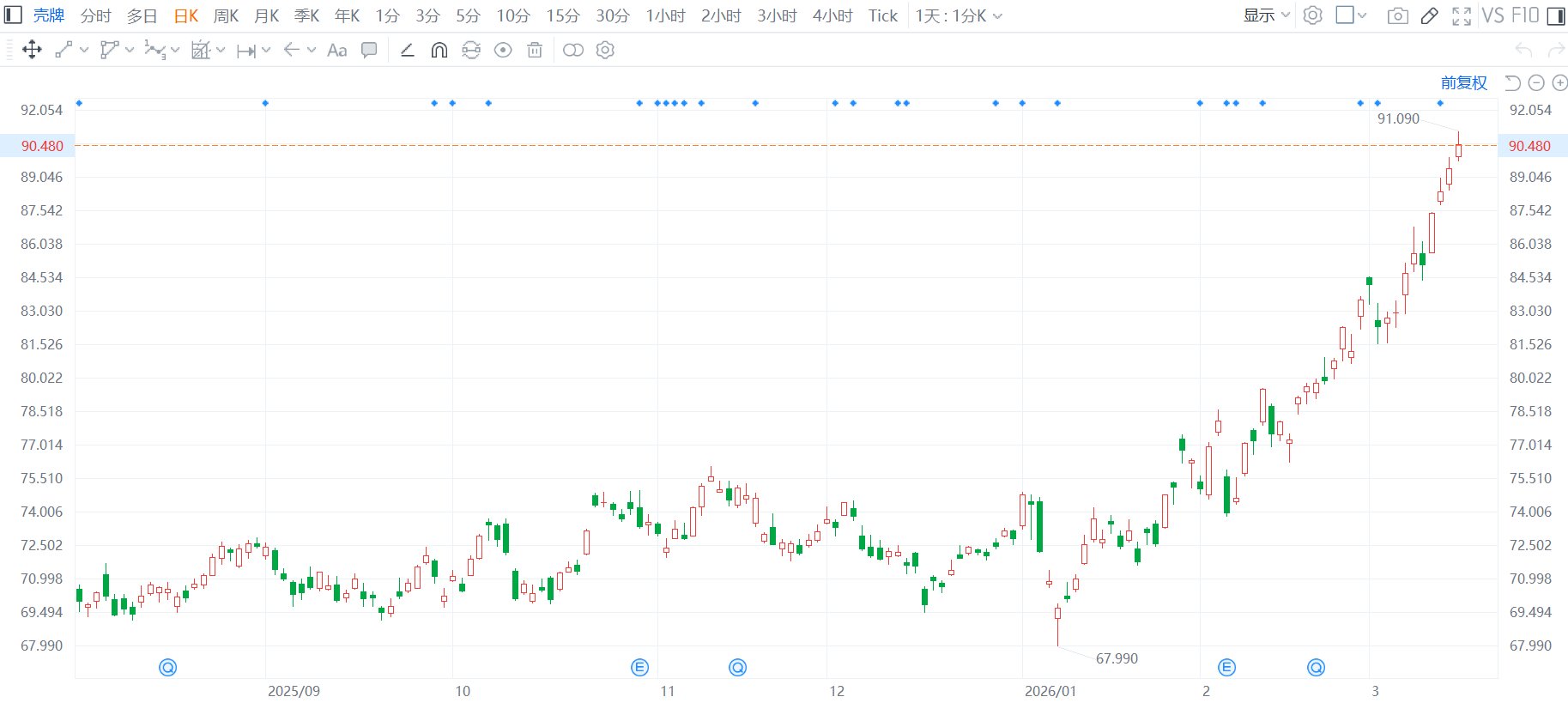 消息面上,油价在经历近一周来首次下跌后出现反弹,伊朗加大对波斯湾周边能源基础设施的袭击。布伦特原油期货涨超4%,回升至每桶105美元附近;WTI原油期货涨超5%,至每桶98美元附近。