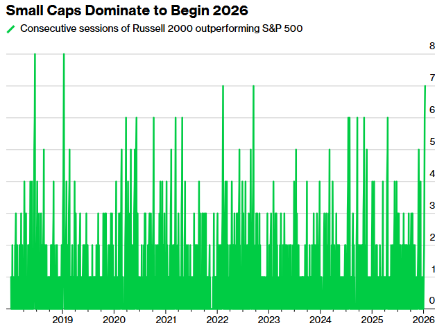 该指数上一次实现更长时间的领先行情,还要追溯至2019年1月——彼时美股正从一轮险些跌入熊市的暴跌中艰难反弹。2018年12月,受利率上行、美中贸易战担忧及经济放缓恐慌等多重因素冲击,标普500指数下跌9.2%,罗素2000指数更是重挫12%。而在随后的2019年1月,罗素2000指数强势反弹11%,同期标普500指数的涨幅为7.9%。