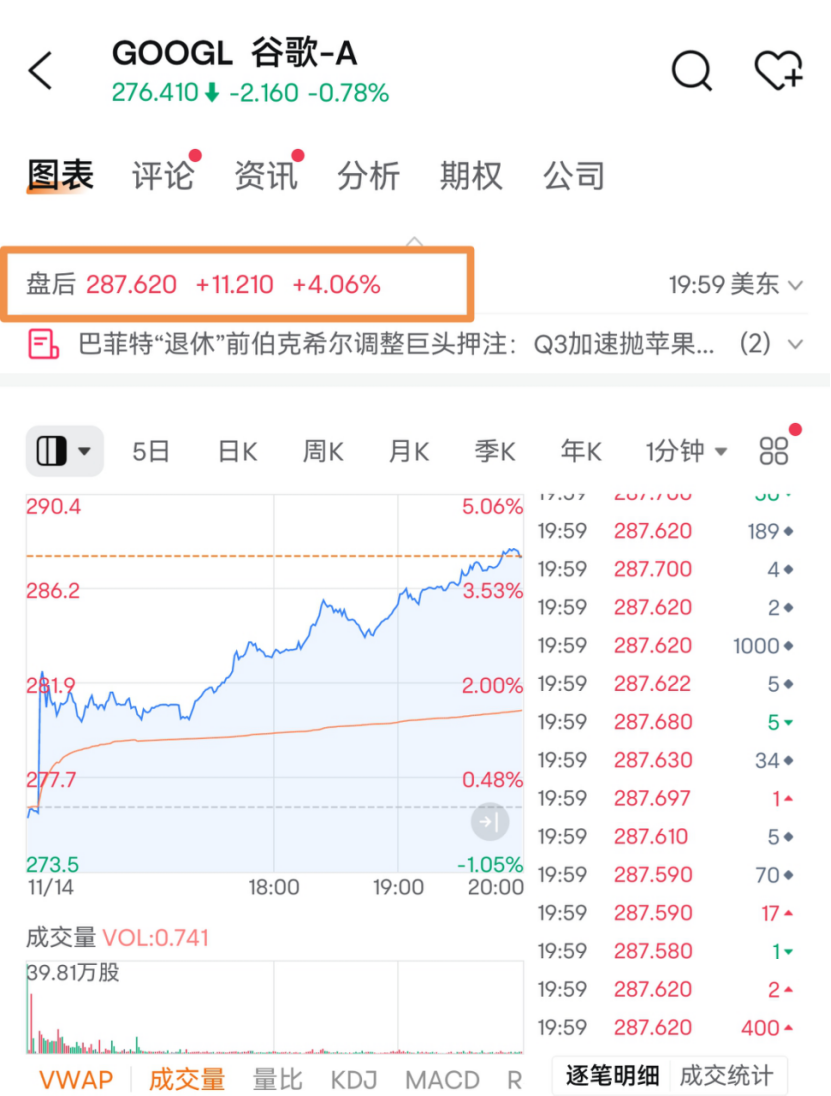 报告显示,第三季度,伯克希尔买入谷歌母公司Alphabet股票。具体来看,伯克希尔在第三季度买入了1790万股Alphabet股票。截至周五收盘,这些股份市值约为49亿美元。上述消息公布后,Alphabet股价在美股盘后交易中上涨4.06%,报287.62美元。如果下周一开盘后维持这一涨势,Alphabet单日市值将增长超1300亿美元。