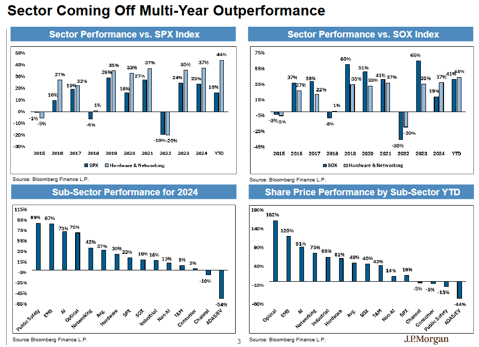 面对近期AI硬件股的回调,摩根大通硬件团队发出明确信号:投资者应坚持持有AI赢家股票,而非进行大规模轮换。更重要的是,该团队预计2026年"网络基础设施"板块的增长将超越"算力",这一结构性转变为投资者提供了新的机会窗口。
