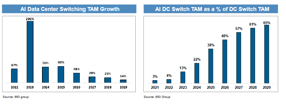 报告援引研究机构650 Group预测称,AI交换机收入将在2026年增长48%,2027年增长29%,2028年增长25%,相比之下,整体数据中心交换机行业的增长率分别为23%、19%和18%。这表明AI正成为交换机行业增长的主要驱动力。