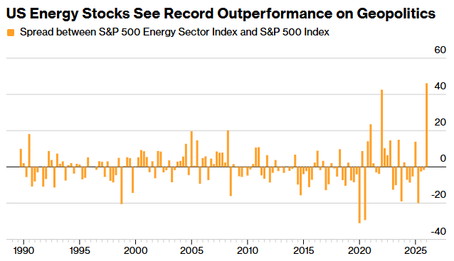 自委内瑞拉1月份迎来新领导人以及2月底伊朗战争爆发以来,由于霍尔木兹海峡交通中断和中东能源设施遭受袭击导致供应紧张,能源股和原油价格持续上涨。布伦特原油价格今年迄今已飙升85%。
