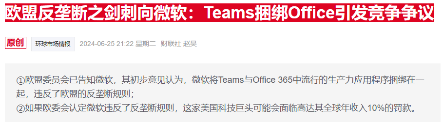去年4月,微软宣布在全球范围内将Teams与Office进行分拆销售,即允许客户以较低的价格购买不包括Teams的生产力套件。但欧委会回应称,微软所做的改变可能还不足以解决竞争问题。