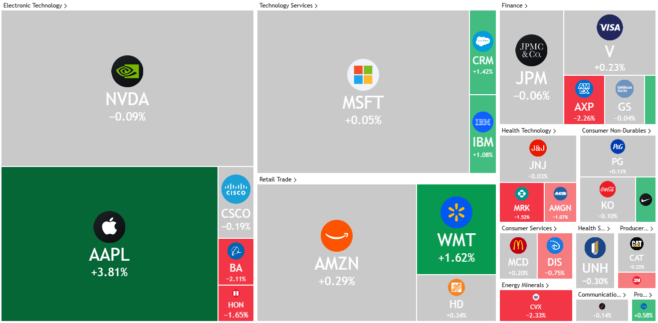 30只道指成分股中,13家上涨17家下跌。其中苹果涨幅最大(+3.81%),该股收于今年3月以来的最高水平。