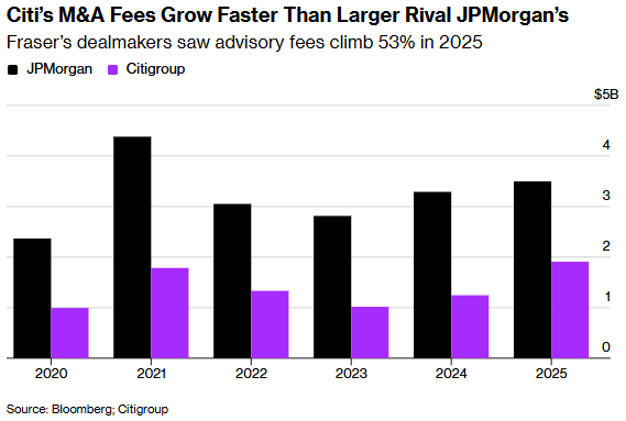 花旗.png"/>长期以来难以跻身顶级投行之列的花旗,正通过业务重组实现突破。弗雷泽于2024年从摩根大通招揽的投行业务主管维斯·拉加万,目前正着力重建花旗的投资银行业务版图。第四季度,该行投行业务总费用(包括债务与股权承销以及并购咨询)增长超三分之一,达到12.9亿美元,但仍逊于摩根大通的23.5亿美元。