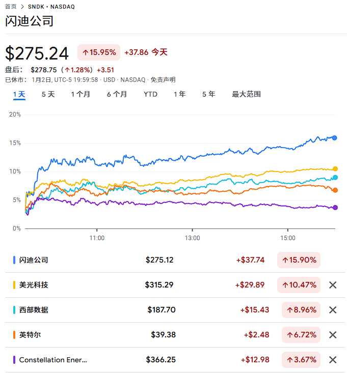 除了台积电、三星电子之外,周五多只AI相关股票录得涨幅。Sandisk、Micron、Western Digital、Intel和Constellation Energy位列涨幅榜前列。英伟达、Broadcom等万亿美元市值科技公司也出现上涨。