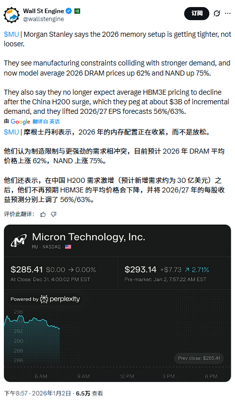 此外,摩根士丹利强调,2026年存储器市场正在收紧而非放松。该行认为制造约束与更强需求相碰撞,并将2026年DRAM平均价格预期上调62%,NAND上调75%。