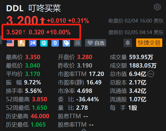 格隆汇2月5日|生鲜电商企业叮咚买菜(DDL.US)美股盘前大幅拉升涨至10%。