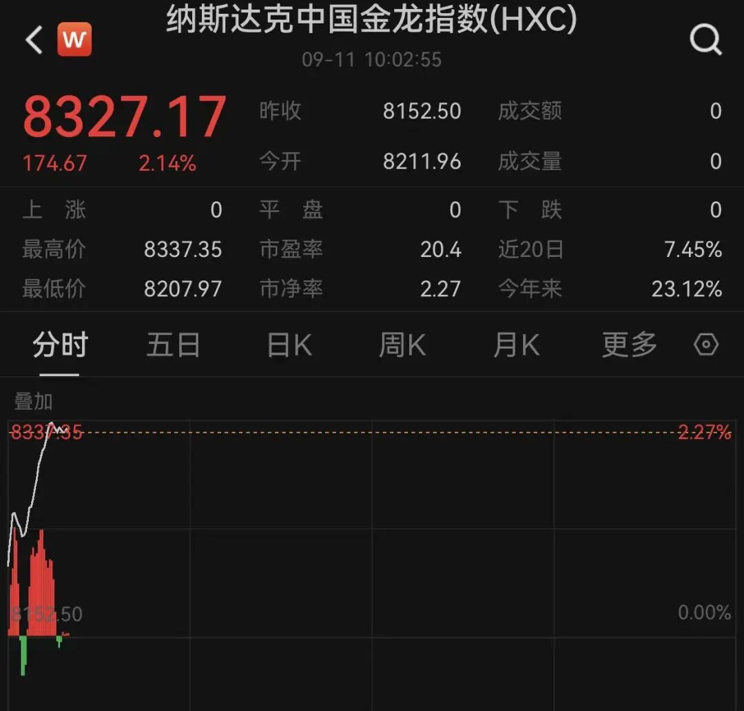 纳斯达克中国金龙指数涨超2%,热门中概股多数上涨。再鼎医药涨超11%,世纪互联涨逾15%,万国数据涨超7%,金山云、叮咚买菜涨超4%,禾赛科技、阿里巴巴涨超3%,蔚来、迅雷涨逾2%。