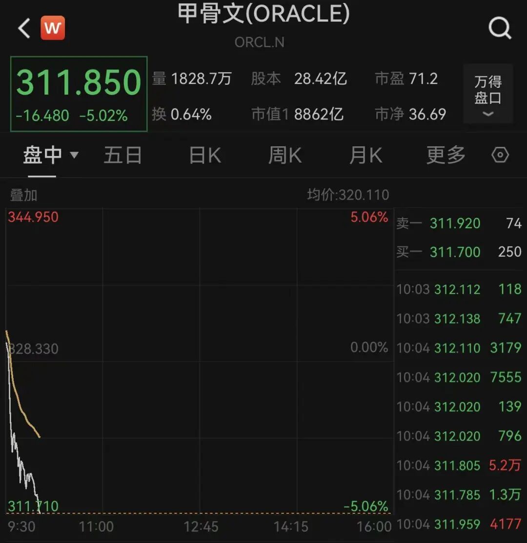 甲骨文盘中跌超5%,公司股价昨日大涨36%,日内市值暴增约2500亿美元。