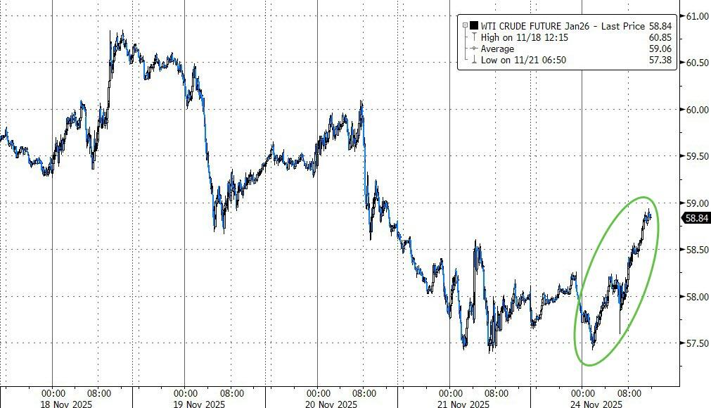 美股午盘,华尔街见闻撰文,俄乌和谈仍在博弈之中,俄罗斯方面表示欧洲提出的和平方案不具建设性。原油扭转上周颓势,WTI原油一度较日低涨近3%。