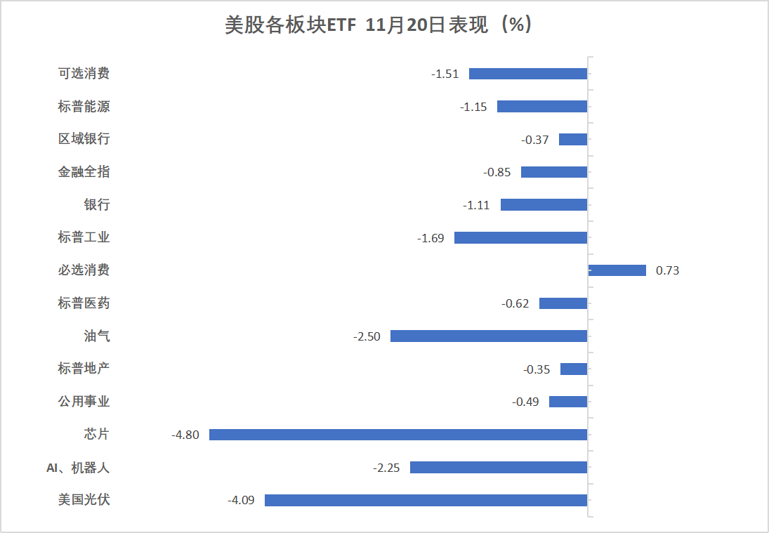 半导体ETF收跌4.22%,科技行业ETF跌3.14%,全球科技股指数ETF跌2.76%,网络股指数ETF跌2.74%。