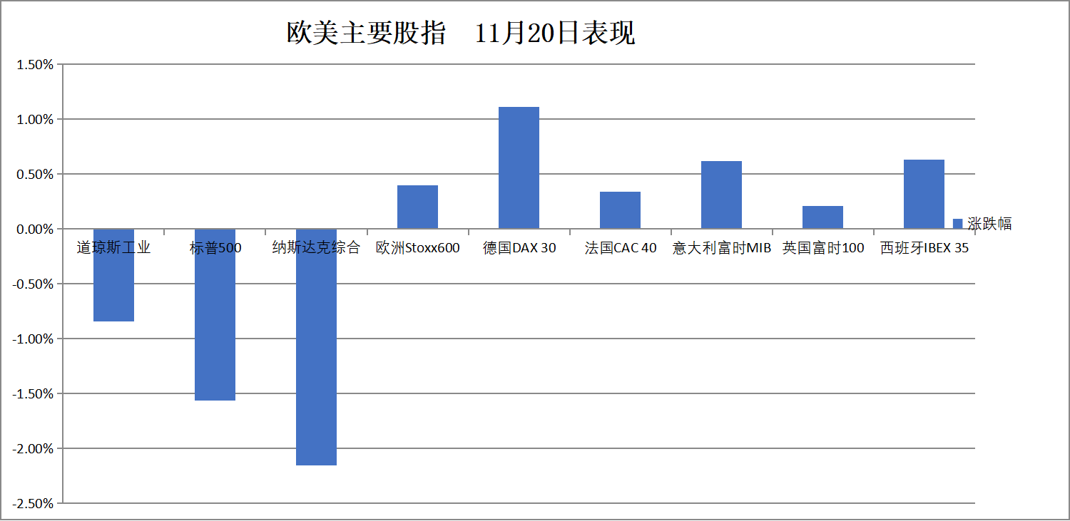 欧元区蓝筹股指冲高回落收涨0.5%,法国巴黎银行涨4.4%,法雷奥跌13%。德国股指收涨0.5%,意大利银行板块涨约1.1%。