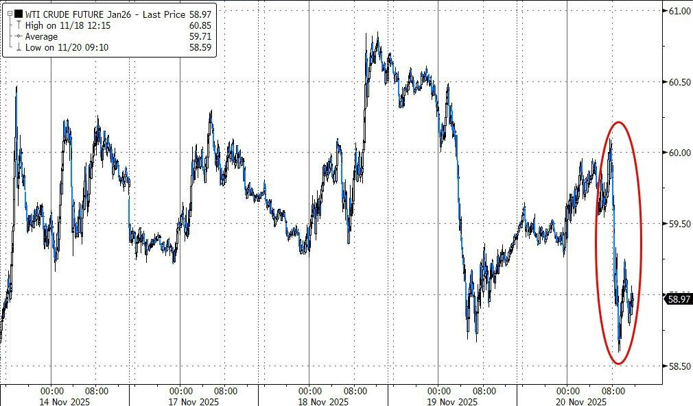 - 美股盘中,据央视报道,泽连斯基已收到美和平计划草案,将与特朗普通话磋商。WTI原油一度较日高下挫近2.5%。