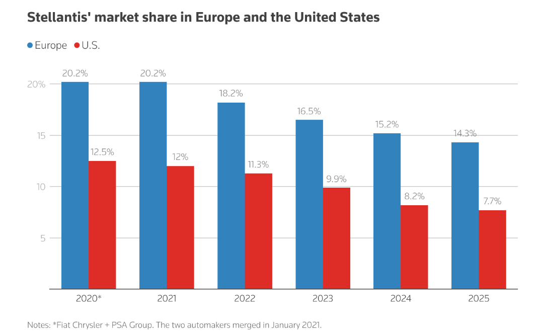 上述的柱状图显示了Stellantis自2020年以来在欧洲和美国的市场份额。