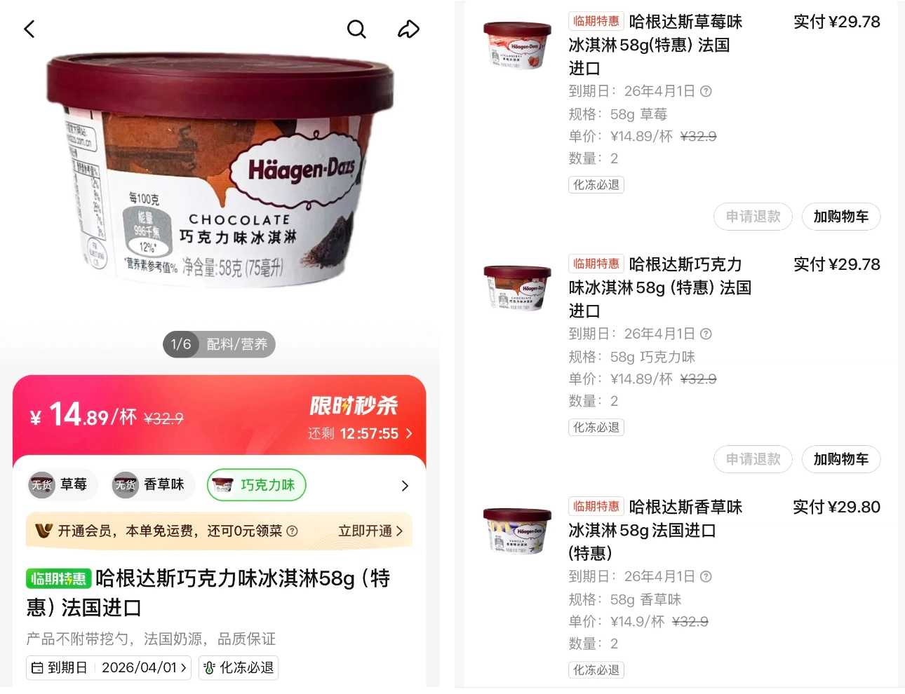 第一财经记者在小象超市软件上发现,原价标为32.9元一盒的58克装产自法国的哈根达斯冰淇淋,现在正以14.89元进行促销。尽管这价格依然比不少竞品价格要高,但打折一定程度也帮助了产品销售,3个口味中有2个口味没过几天就缺货了。