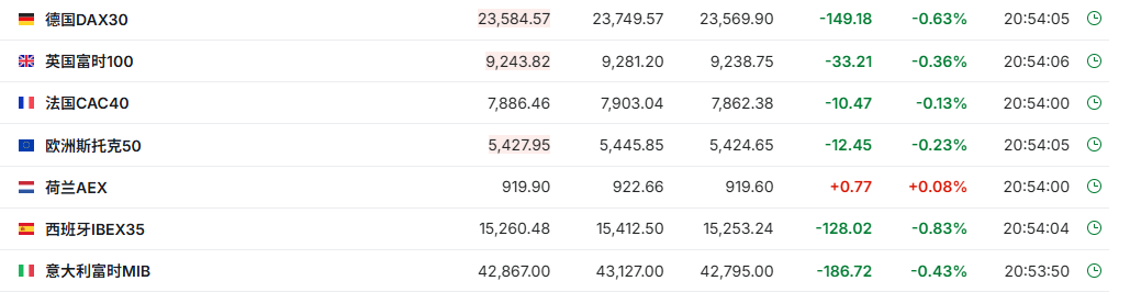 正在交易的欧洲股市整体走低,德国DAX指数现跌0.63%,英国富时100指数跌0.36%,法国CAC40指数跌0.13%。