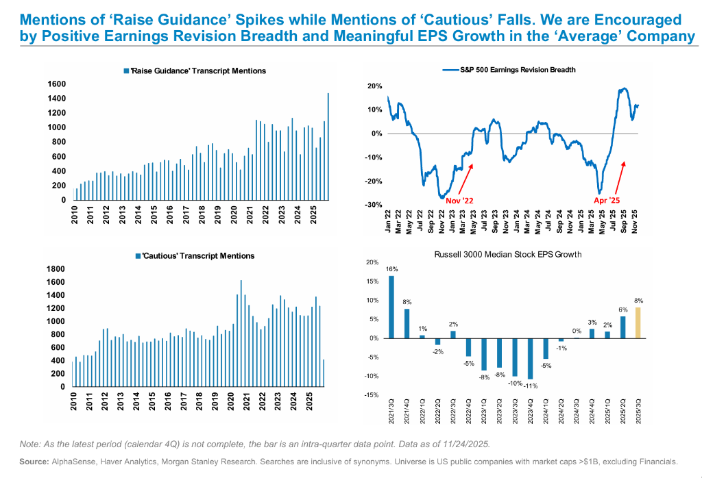 这种乐观情绪也反映在更广泛的盈利预期上。报告显示,标普500指数的盈利修正广度(Earnings Revision Breadth)出现积极上行,同时罗素3000指数中位数公司的EPS增长率也展现出强劲的复苏态势。摩根士丹利策略师对这些信号感到“鼓舞”。