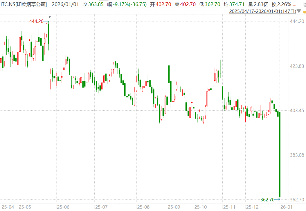 印度政府对香烟加征新税,导致该国烟草类股周四遭遇重挫,市场领军企业印度烟草公司ITC股价创近六年来最大单日跌幅。