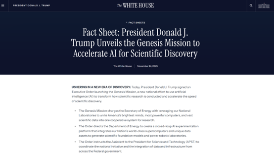 11月25日讯(编辑 卞纯)综合央视新闻等媒体报道,当地时间11月24日,美国白宫发布声明表示,总统特朗普签署了一项行政命令,启动一项旨在利用人工智能(AI)变革科学研究方式、加速科学发现的全新国家计划“创世纪计划”(Genesis Mission)。