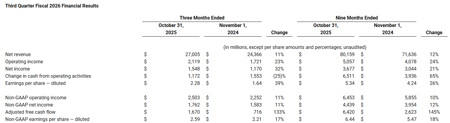 戴尔科技公布的2026财年第三季度财报显示,该公司当季营收同比增长11%至270.05亿美元,创下历史新高,但不及分析师普遍预期的272亿美元。在Non-GAAP会计准则下,经营利润为25.03亿美元,同比增长11%;净利润为17.62亿美元,同比增长11%。调整后的每股收益为2.59美元,好于分析师普遍预期的2.48美元。