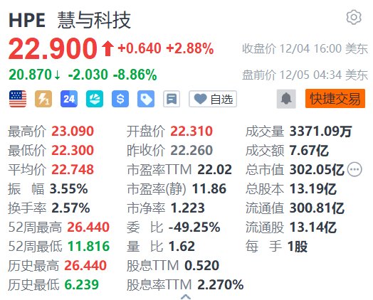 美股异动|慧与科技跌近9% 上季AI服务器新订单低于预期