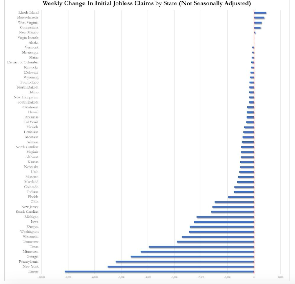 具体来看,伊利诺伊州、纽约州和宾夕法尼亚州是失业救济申请人数降幅最大的三个州,而罗德岛州和马萨诸塞州的失业救济申请人数则略有上升。
