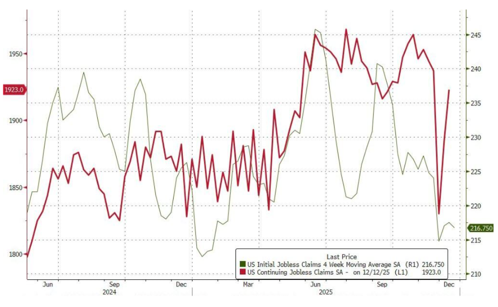 美国12月13日当周续请失业救济人数录得192.3万人,高于预期的190万人及前值189.7万人。该数据虽已从早前政府停摆与感恩节造成的季节性波动中回升,但仍显著低于年内高位水平。