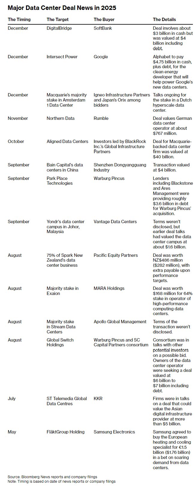 周一,软银集团(SFTBY.US)成为最新加入战局的企业,宣布与数字基础设施投资商DigitalBridge(DBRG.US)达成价值数十亿美元的收购协议,这也推动了今年全球数据中心并购交易额突破700亿美元。以下为今年数据中心相关并购交易动态一览。