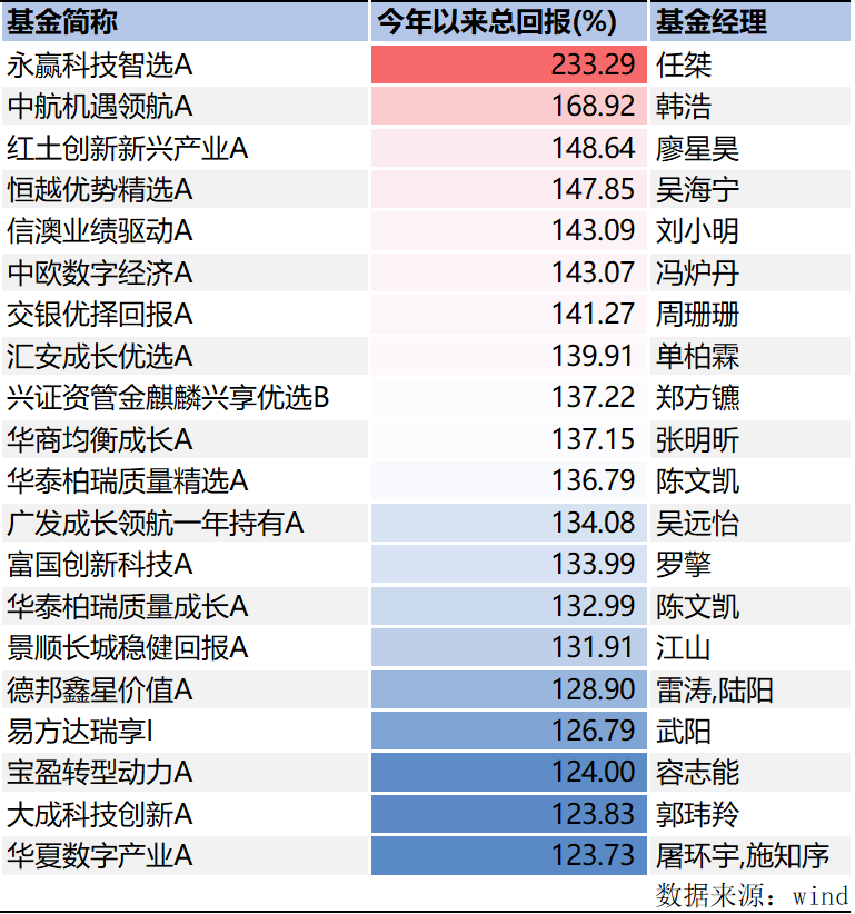 收益率亚军是韩浩管理的中航机遇领航基金,年内涨幅超过接近169%。中航机遇年内聚焦投资的也是AI产业链等领域。