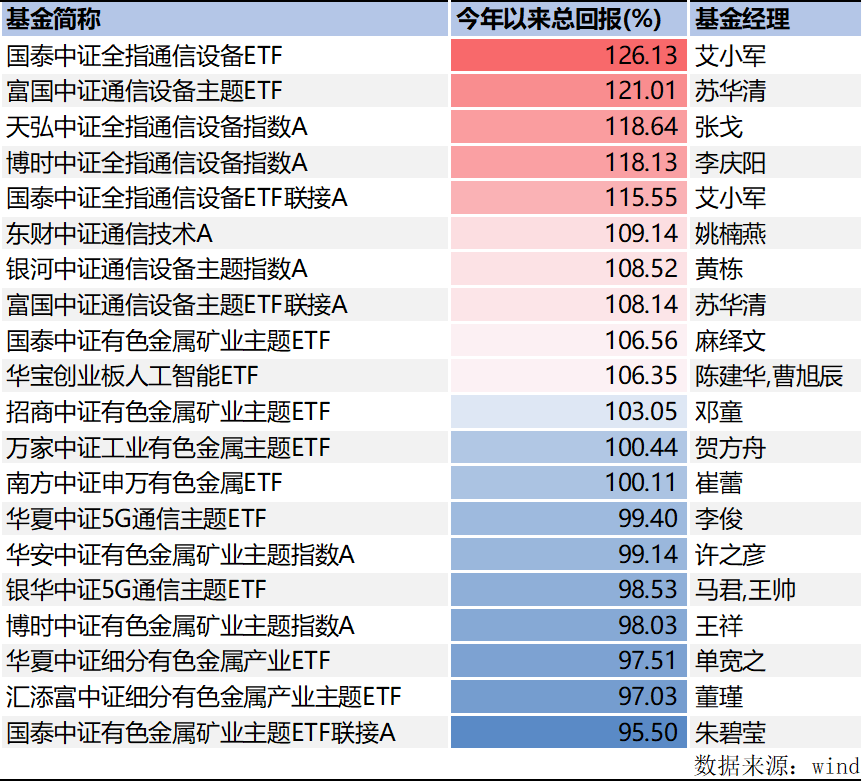 除了一只有色金属矿业主题的ETF,几乎都被通信设备、人工智能包圆了。当然,到了第11到20名之间,有色金属主题的更多。