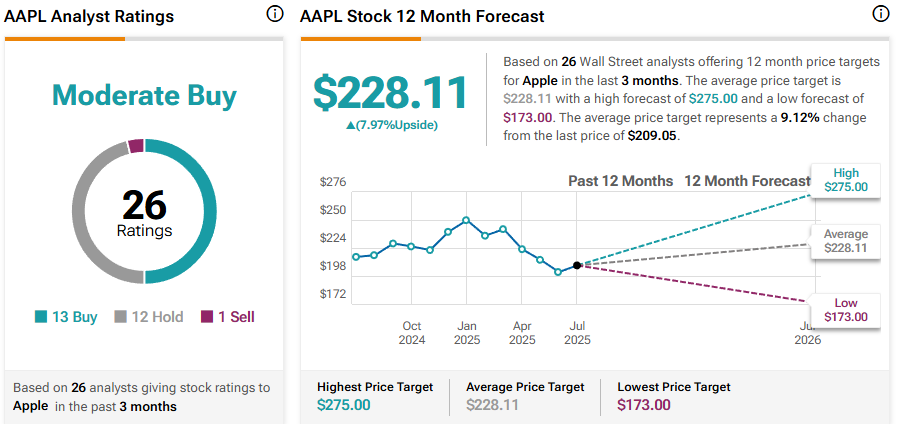 TipRanks数据显示,总体而言,华尔街分析师予苹果“适度买入”评级,平均目标价为228.11美元,较当前股价水平高出8%。