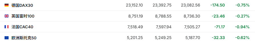 2. 截至发稿,德国DAX指数跌0.75%,英国富时100指数跌0.27%,法国CAC40指数跌0.94%,欧洲斯托克50指数跌0.62%。