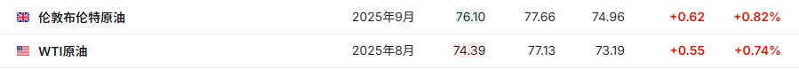 3. 截至发稿,WTI原油涨0.74%,报74.39美元/桶。布伦特原油涨0.82%,报76.10美元/桶。