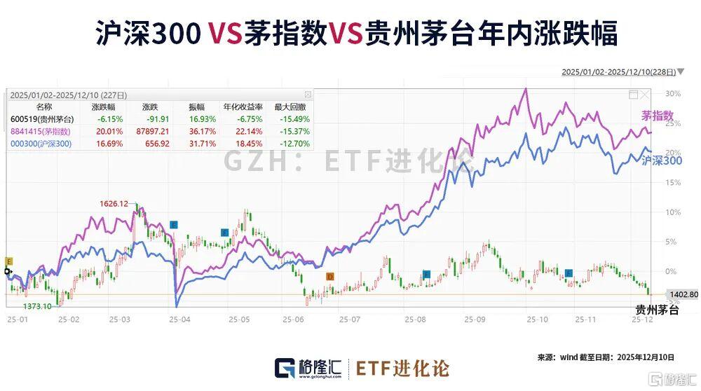 今年茅台股东的日子不轻松。2025年沪深300指数涨16.69%,茅指数涨20.01%,贵州茅台股价却跌了6.15%。