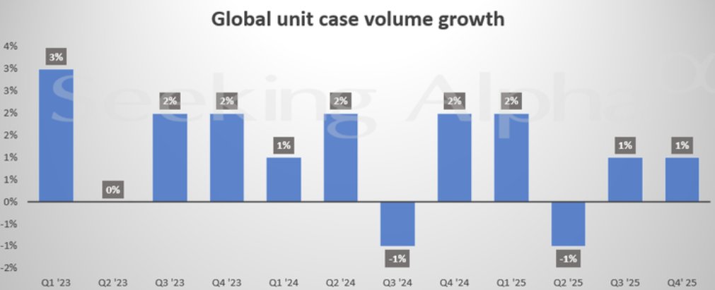 第四季度,可口可乐的价格/产品组合增长了 1%,这主要得益于市场上的价格策略,但部分被不利的产品组合所抵消。