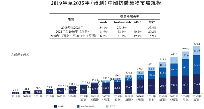 中国抗体药物市场规模从2019年的人民币288亿元迅速增长至2024年的人民币1,312亿元,复合年增长率为35.4%。未来十年,随着更多抗体药物纳入国家医保药品目录、生物类似药的可及性提高以及创新抗体产品的上市,中国抗体药物市场预计将从2024年的人民币1,312亿元增长至2030年的人民币3,964亿元,复合年增长率为20.2%,并进一步增至2035年的人民币8,302亿元,2030年至2035年的复合年增长率为15.9%。按产品类型划分,单克隆抗体预计仍将是最大的细分市场,而双特异性及多特异性抗体和ADC均预计录得更快增长。特别是,中国的ADC市场预计将从2024年的人民币39亿元显著扩大至2030年的人民币662亿元及2035年的人民币1,586亿元,2024年至2030年的复合年增长率为60.1%,2030年至2035年的复合年增长率为19.1%。