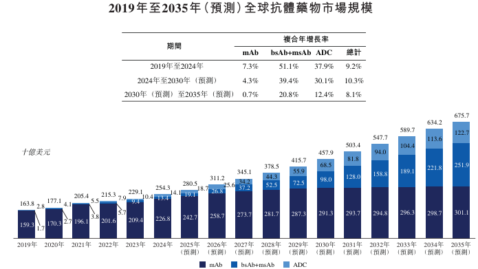 近年来,全球抗肿瘤药物市场显著扩大,从2019年的1,435亿美元增长至2024年的2,533亿美元,复合年增长率为12.0%,并预计将于2030年进一步增长至4,525亿美元,并于2035年增长至7,027亿美元,2024年至2030年的复合年增长率为10.2%,2030年至2035年的复合年增长率为9.2%。中国抗肿瘤药物市场亦从2019年的人民币1,827亿元增长至2024年的人民币2,582亿元,复合年增长率为7.2%,并预计将于2030年进一步扩大至人民币5,273亿元,于2035年达到人民币10,420亿元,2024年至2030年的复合年增长率为12.6%,2030年至2035年的复合年增长率为14.6%。