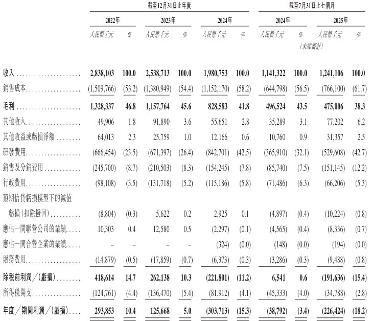 2022年度、2023年度、2024年度及2025年截至7月31日止七个月,该公司毛利率分别约为46.8%、45.6%、41.8%、38.3%。