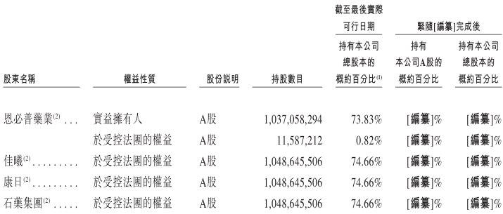 截至最后实际可行日期,该公司的控股股东恩必普药业合计持有1,048,645,506股A股,约占公司已发行股份总数的75.30%(不包括已回购并于公司股票回购账户持有的12,000,225股A股)(其中约74.47%已发行股份为直接持有,及约0.83%已发行股份为通过其全资附属公司石药欧意药业间接持有)。恩必普药业由佳曦及石药集团分别拥有45.94%及54.06%。佳曦由康日全资拥有,而康日由石药集团全资拥有。因此,恩必普药业、石药欧意药业、康日、佳曦及石药集团构成控股股东集团。