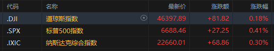 截至收盘,道琼斯指数涨0.18%,报46397.89点,刷新了9月22日录得的历史纪录;标普500指数涨0.41%,报6688.46点;纳斯达克综合指数涨0.3%,报22660.01点。