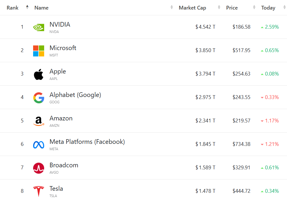 (按市值排列)微软涨0.65%,苹果涨0.08%,谷歌C跌0.33%,亚马逊跌1.17%,Meta跌1.21%,博通涨0.61%,特斯拉涨0.34%。