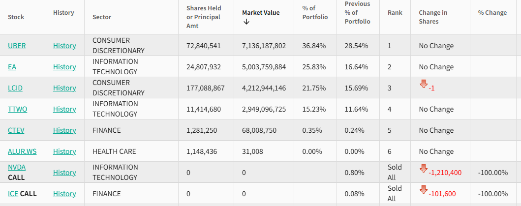 目前,这支规模接近1万亿美元的基金,只持有6家上市公司的股票,分别为优步、艺电、Lucid Group、Take-Two互动软件、Claritev和Allurion Technologies。
