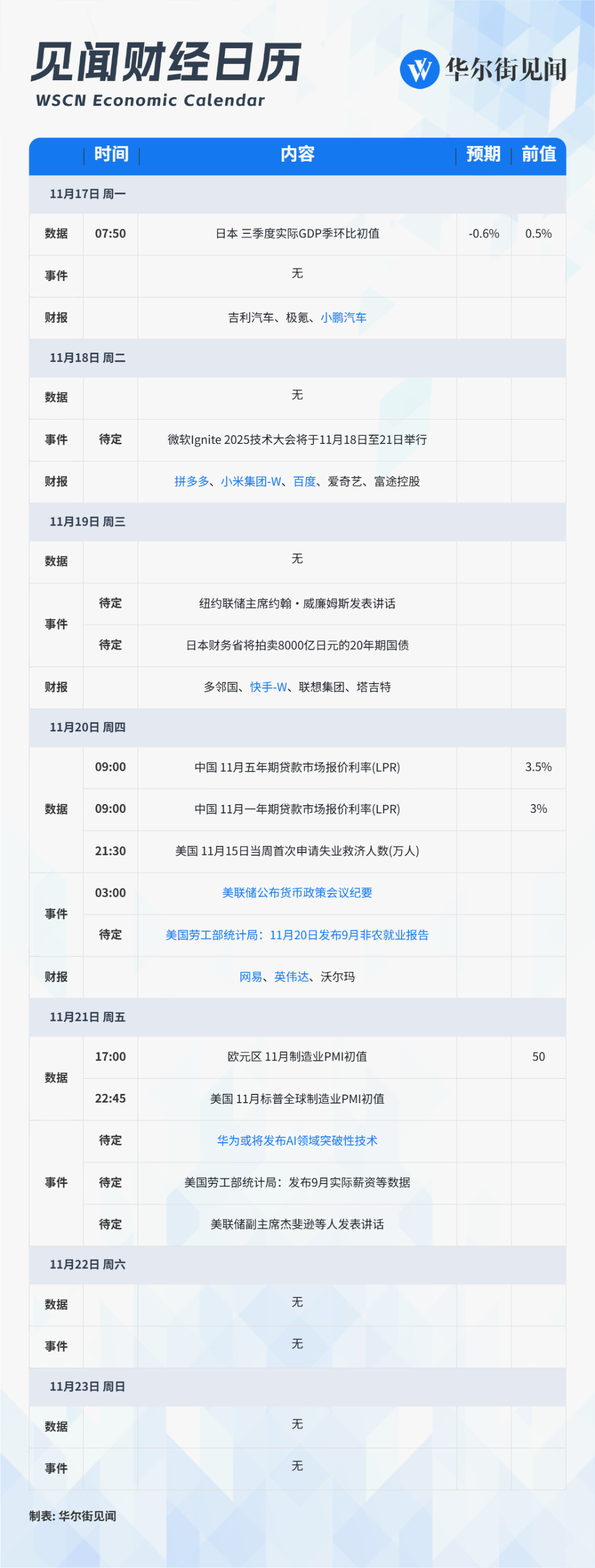 此外,日本三季度GDP数据,美欧最新PMI数据将公布。日本财务省将拍卖8000亿日元的20年期国债。微软Ignite 2025技术大会,迪拜航空展,中国光伏、半导体等多个行业大会及展会即将举行。