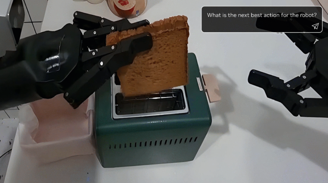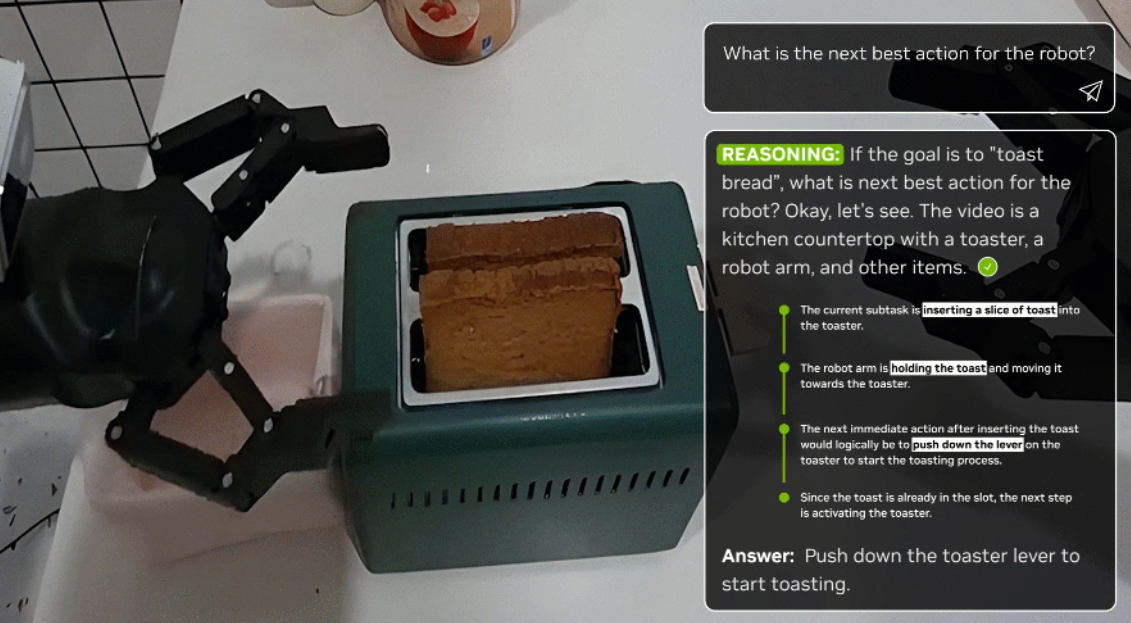 在英伟达给出的案例中,运行视觉推理模型的机器人手臂,成功根据“面包+烤面包机”的场景,推断出最合理的下一步动作是将面包放进烤面包机进行烘烤,并将思考逻辑转化成机器手臂的操作指令。