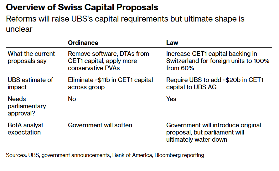 如上图所示的瑞士资本提案概览——这些改革将大举提高瑞银的资本金要求,但最终形态仍不明朗。
